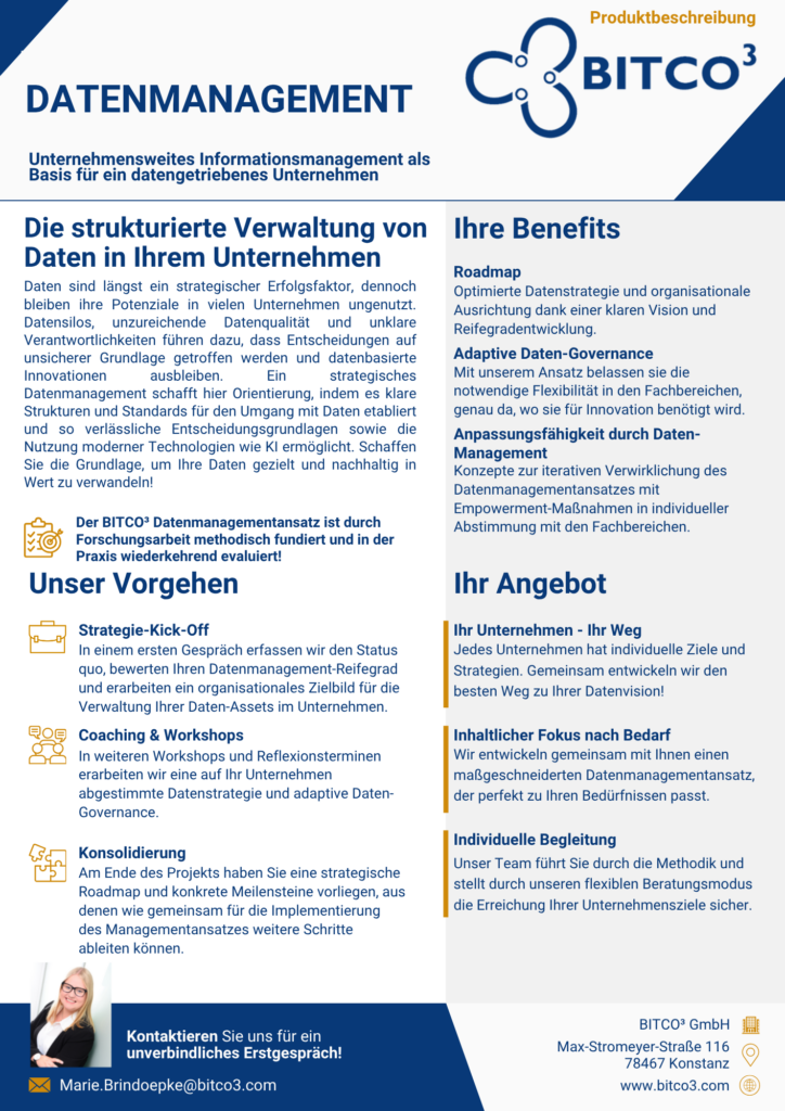 Daten sind längst ein strategischer Erfolgsfaktor, dennoch scheitern Unternehmen weiterhin an Datensilos, unzureichender Datenqualität und unklaren Verantwortlichkeiten. Ein strategisches Datenmanagement schafft die Grundlage für datenbasierte Geschäftsmodelle, fundierte Entscheidungen und effiziente Prozesse. Unser Reifegradmodell für Datenmanagement bildet ein umfangreiches Rahmenwerk zur (Weiter-) Entwicklung Ihres Datenmanagments. Die ganzheitliche Sicht auf Daten und das strukturierte, unternehmensweit einheitliche Vorgehen bilden die Grundlage für die wertschöpfende Nutzung.